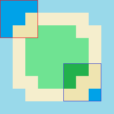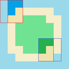 Next, we need to look at each pixel in the image and use code to generate a list of rules for which pixels are allowed to go next to other pixels. For example, in this image, water pixels can only touch water and sand, but never touch grass. Conversely, grass can touch other grass and coast, but never water. This is where techniques often differ - do we just check adjacent tiles, or a larger region? How do we store this information?