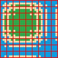 Okay, now every possible pattern of tiles knows whether or not it can be placed next to any other tile. How do they get placed? Well, we start by defining an output size - we can use the patterns generated from the original image to generate a much larger one! In that output image, every pixel is currently empty, and therefore any of our tiles can be placed at any location. We'll pick a random one to start.